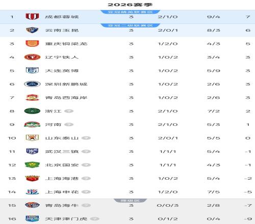 随着山东泰山客场0比4负于云南玉昆,中超第3轮的比赛全部结束。成都蓉城继续领跑中超积分榜,而三战不胜的青岛...