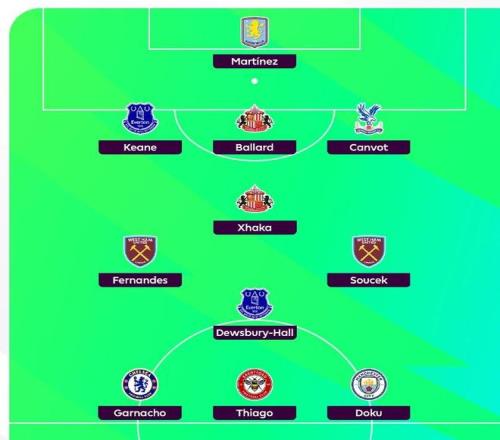 中场:扎卡(桑德兰)、马特乌斯-费尔南德斯(西汉姆联)、绍切克(西汉姆联)、迪尤斯伯里-霍尔(埃弗顿)