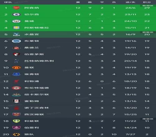 随着曼联01埃弗顿,英超第12轮结束了所有比赛,最新积分榜如下