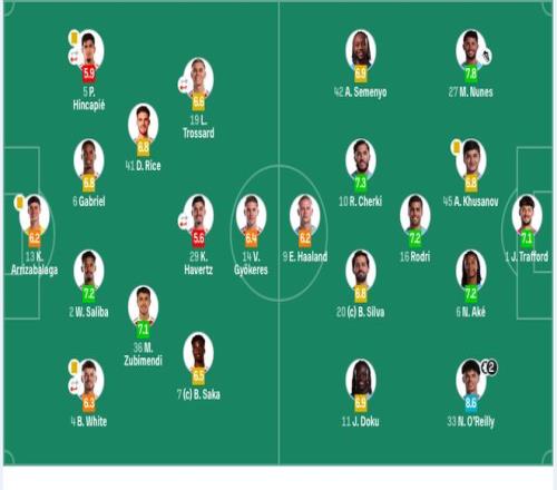 曼城首发:1-特拉福德、27-努内斯、45-胡桑诺夫、6-阿克、33-奥赖利、16-罗德里、20-B席、42-塞梅尼奥、10-谢尔基(90’47-福登)、11-多库、9-哈兰德。