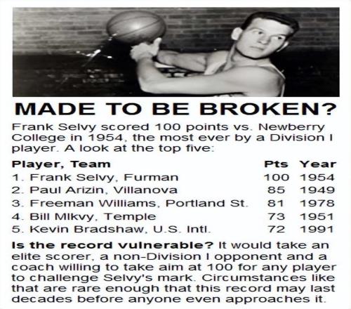 1954年2月13日,那是南卡罗来纳州格林维尔市球迷永远难忘的一天。在对阵纽伯里学院的比赛中,塞尔维手感热得发烫。队友们见状,干脆战术也不打了,全场疯狂给他喂球。最终,他全场66投41中,罚球22罚18中,在终场哨响前稳稳命中,刚好凑齐100分大关!